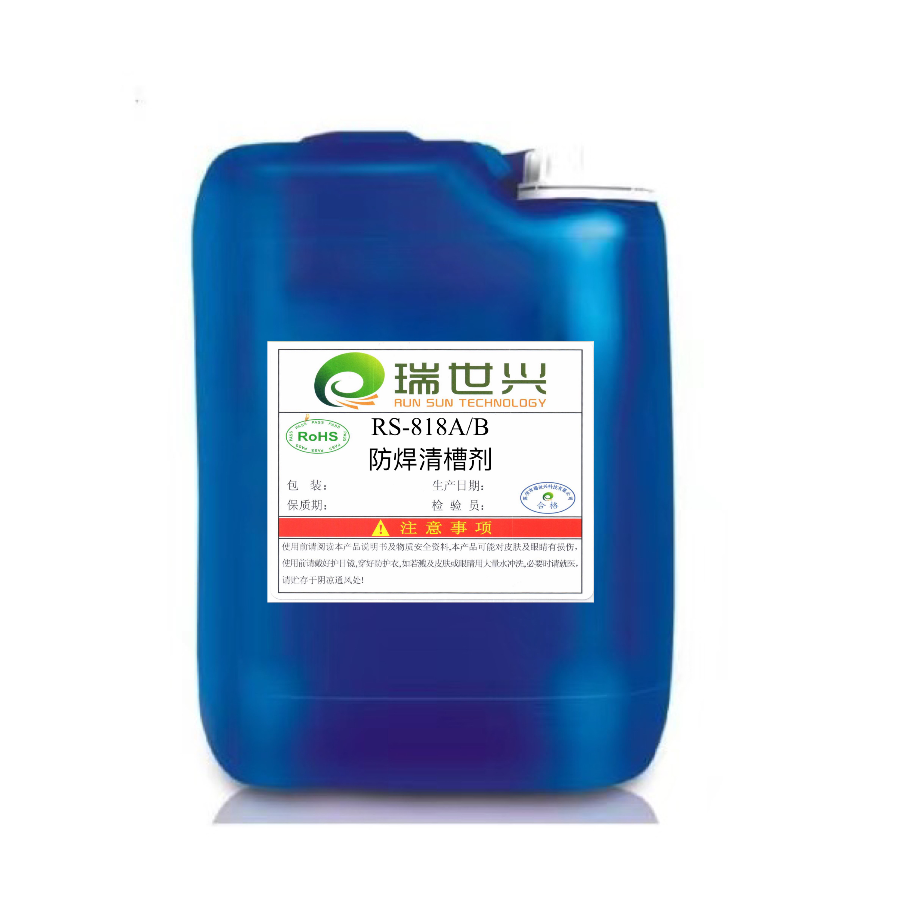 產(chǎn)品用途:在線路板油墨顯影生產(chǎn)中,綠漆的殘留物隨著時間推移而容易累積到輥輪和槽壁上,在后續(xù)生產(chǎn)中,容易反粘在板面上而造成PAD污染,對化金,化錫等后制程造成不良。RS-818A/B雙劑型混用清槽劑通過溶解和剝離兩種共同作用能將綠漆清洗掉,對輥輪和槽壁無任何傷害